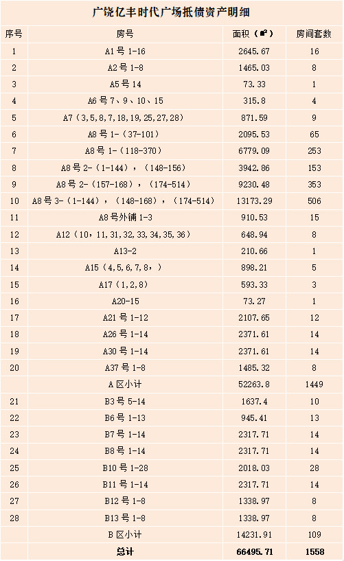 基本情況:該抵債資產(chǎn)位于東營(yíng)市廣饒縣廣饒濰高路888號(hào)億豐國(guó)際時(shí)代廣場(chǎng),廣饒老汽車站西鄰。總建筑面積66495.71㎡,房間1558套,經(jīng)法院裁定抵債,未辦理過戶手續(xù)。